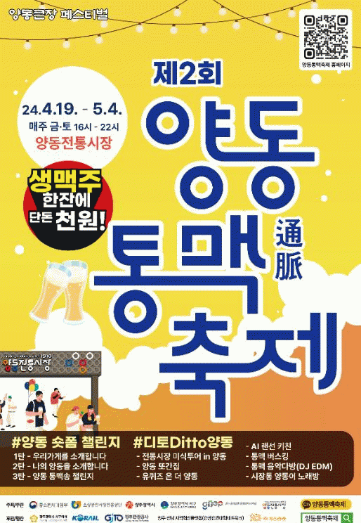 또한 축제 기간에 시장통 양동이 노래방, 레트로 감성을 살린 ‘통맥 DJ EDM’파티, 통맥버스킹, 온라인 디지털커머스 ‘집으로 ON 양동’, 보물찾기 이벤트 등 축제 방문객과 시장상인들이 함께 하는 코너도 진행된다.