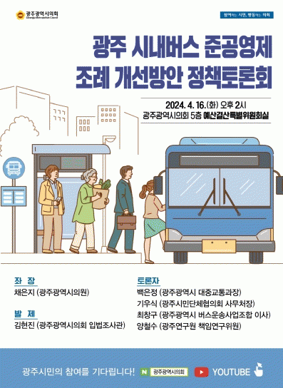 전문가 토론에는 백은정 광주시 대중교통과장, 기우식 시민단체협의회 사무처장, 최창구 광주시 버스운송사업조합 이사, 양철수 광주연구원 책임연구위원이 참여한다.