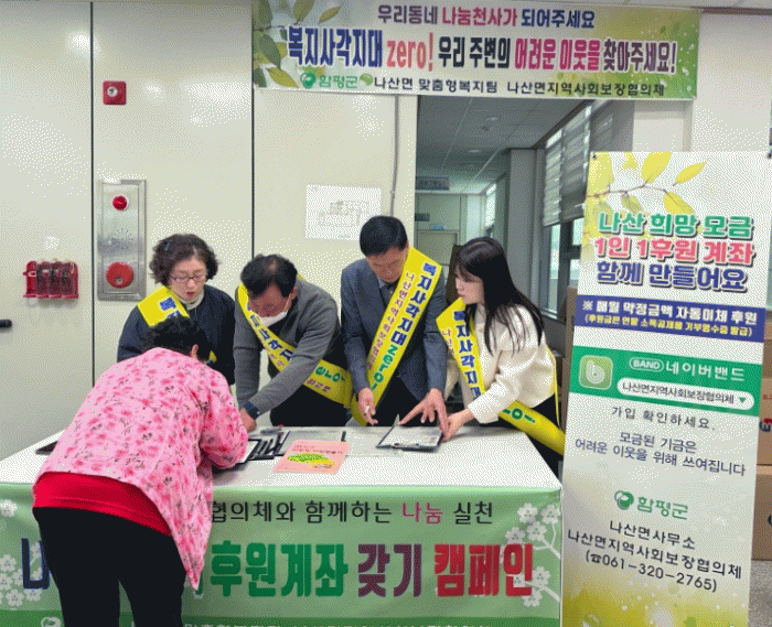 한편 나산면 복지재원 마련을 위한 ‘1인 1후원계좌 갖기 캠페인’은 현재까지 총 104명의 정기후원자가 참여하고 있다.