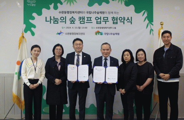 협약을 시작으로 5월 어버이날을 맞아 수완동 어르신 100명 대상 나눔의 숲 캠프를 진행한다. 이어서 7월 여름방학 동안 지역아동센터 이용 아동 대상 어린이 맞춤형 숲속 캠프를 열 예정이다.