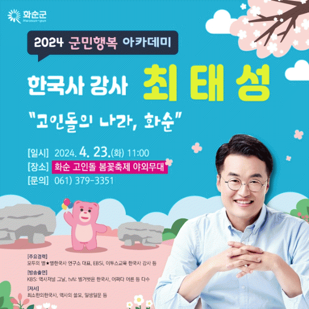 이번 아카데미 2회차 강연은 화순 고인돌 봄꽃 축제 기간에 맞춰 특별히 축제장으로 강연 장소를 옮겨 야외에서 진행하며, 강연 시작도 오전 11시로 조정됐다.