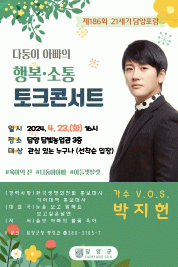 이번 강좌는 연예계 대표 다둥이 아빠인 가수 박지헌(V.O.S)을 초청해 저출산 인식 개선 강연을 통해 아빠가 함께하는 육아 문화를 확산하고 초저출산으로 인한 인구 감소에 따른 지방소멸 위기에 대응하고자 기획했다.