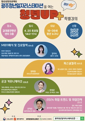 ‘청년 업(UP)+’ 특강에 대한 자세한 내용은 광주청년정책플랫폼과 광주청년일자리스테이션 누리집에서 확인할 수 있고, 참여를 원하는 청년은 18일 밤 11시30분까지 온라인 링크를 통해 신청서를 제출하면 된다.