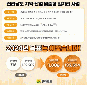 전남도는 고용부 지역산업 맞춤형 일자리사업과 함께 도 공모 사업을 2022년부터 추진하고 있다. 2023년에는 716명 취·창업, 13만 2천여 건의 일자리 연계 실적을 내 도민의 큰 호응을 얻었다.