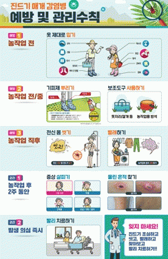 진드기에 물리지 않는 것이 가장 중요한 예방법이어서 농작업 등 야외활동 시 △긴 옷과 바지, 모자 등 잘 입기 △기피제 뿌리기 △풀숲·밭 피하기 △야외활동 후 털고·씻고·빨래하기 등을 생활화해야 한다.
