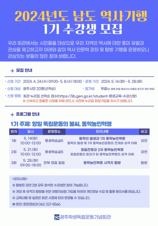참가 신청은 4월 24일부터 5월 8일까지 광주학생독립운동기념회관 누리집에서 회원가입 후 가능하며 선착순 20명을 모집한다. 1·2회차 강연 모두 참석한 수강생에 한하여 3회차 탐방 기회가 주어지며 참가비는 무료이다.