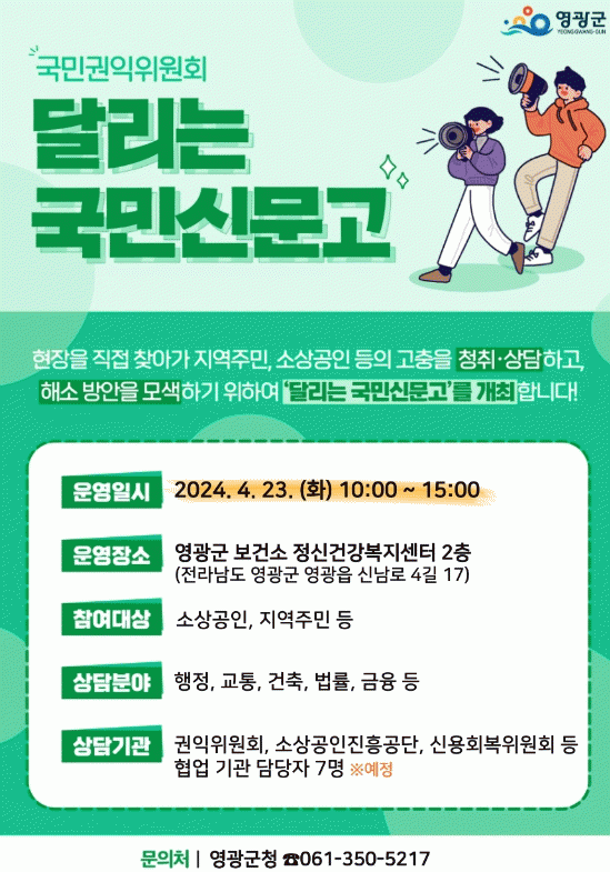 영광군과 국민권익위원회가 주관하는 ‘달리는 국민신문고’는 국민권익위원회 고충 민원을 포함한 소상공인 및 신용회복 상담반 등 총 7명의 분야별 전문조사관들이 군민들의 고충과 질의 사항을 청취하고 해결방안을 모색해주는 현장 중심의 찾아가는 상담 제도이다.