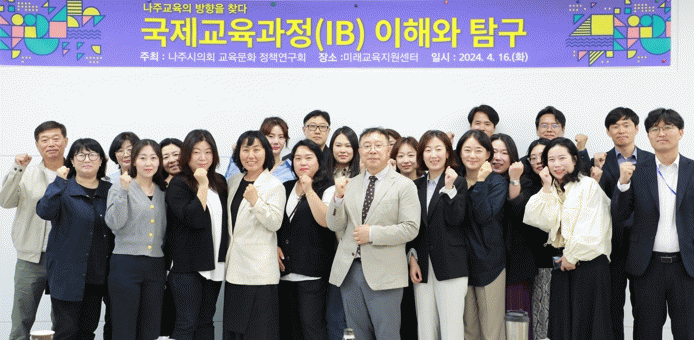 이번 강연은 나주시의회 교육문화정책연구회(의원연구단체) 소속 의원과 나주교육지원청 관계자 및 학부모단체 시민 40여명이 참석한 가운데 IB 교육과정에 대한 이해를 돕고 나주시의 교육 정책이 나가야할 방향을 논의하기 위해 마련됐다.