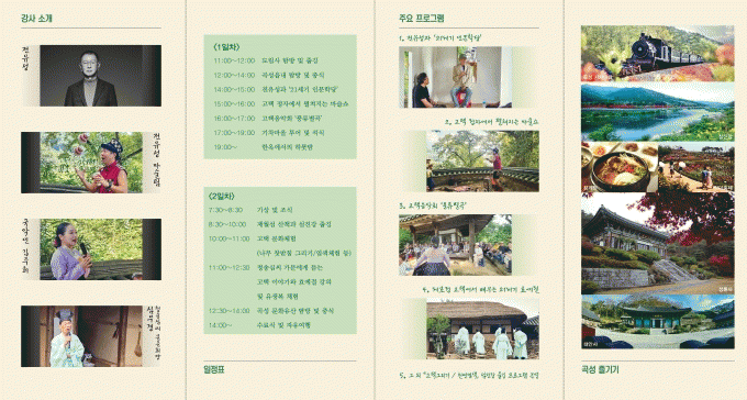 올해 곡성 제호정 체험 프로그램은 4월 13일을 시작으로 4월 27일. 5월 11일, 25일, 6월 22일, 10월 19일로 1박 2일동안 총 6회 진행될 예정이고, 프로그램에 대한 상세한 정보는 곡성제호정고택체험 홈페이지를 방문하여 확인할 수 있다.