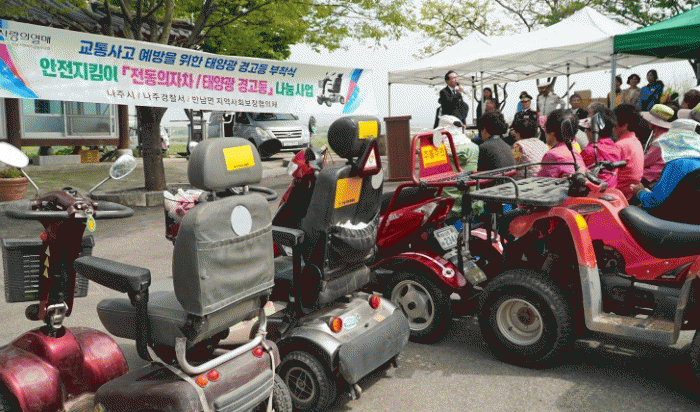 경고등 부착은 보행이 불편한 농촌지역 노년층의 주 이동 수단으로 자리 잡은 전동의자차의 교통사고 예방 차원에서 이뤄졌다.