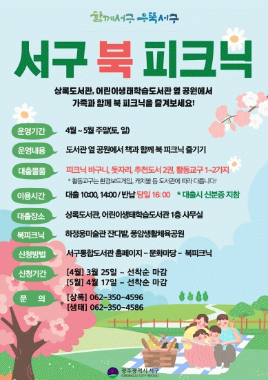 서구는 4월과 5월 매주 토?일요일에 상록도서관 옆 하정웅미술관 잔디밭, 어린이생태학습도서관 입구 풍앙생활체육공원에서 ‘서구 북 피크닉(Book Picnic)’ 행사를 개최한다.