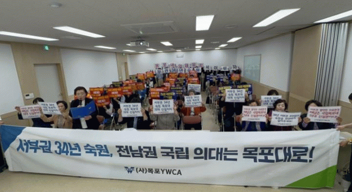 이날 목포 YWCA 임원과 회원 70여명은 “의료기관에 대한 접근성이 떨어지고 공공의료 분야가 취약한 전남 서부권의 열악한 의료현실을 외면하지 말고 국립목포대학교에 의과대학을 신설하라”는 성명서를 발표하면서 국립목포대학교에 의과대학을 설립할 것을 촉구했다.