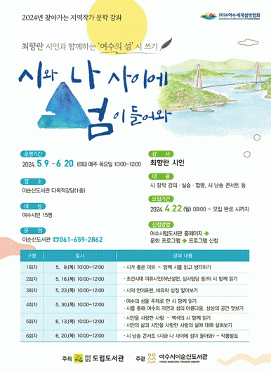 ‘시와 나 사이에 섬이 들어와’는 전라남도립도서관이 시·군 지역작가와 협업을 통해 운영하는 ‘2024년 찾아가는 지역작가 문학 강좌’의 일환으로 추진된다.