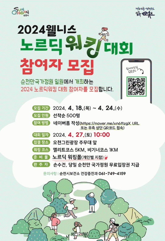 노르딕 워킹에 관심 있는 국민이라면 누구나 참여 가능하며, 참여를 원하는 분은 오는 24일까지 순천시 대표 SNS(블로그, 페이스북, 인스타), 순천시 홈페이지에서 네이버폼(QR코드)을 통해 신청 접수하면 된다.