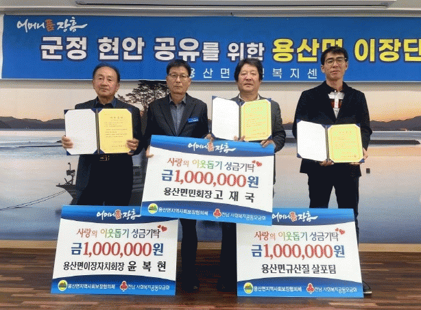 지난 18일 용산면 고재국 면민의 장, 용산면 규산질 살포팀, 용산면 윤복현 이장자치회장, 동양농기계 이종재 대표는 나눔 실천을 위해 성금 각 1백만 원을 용산면 지역사회보장협의체에 기탁해 이웃 사랑을 실천했다.