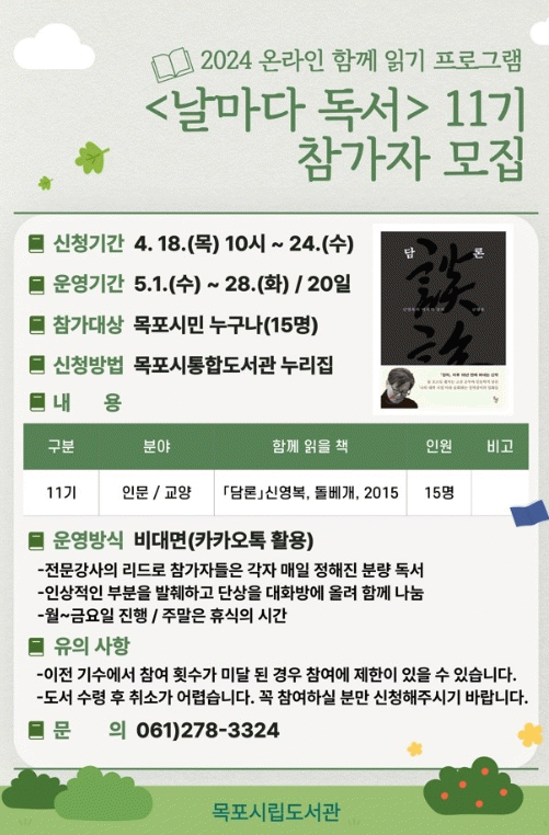 참가 신청은 지난 18일부터 목포시통합도서관 누리집에서 접수받고 있으며, 프로그램 관련 문의는 목포시립도서관으로 하면 된다.