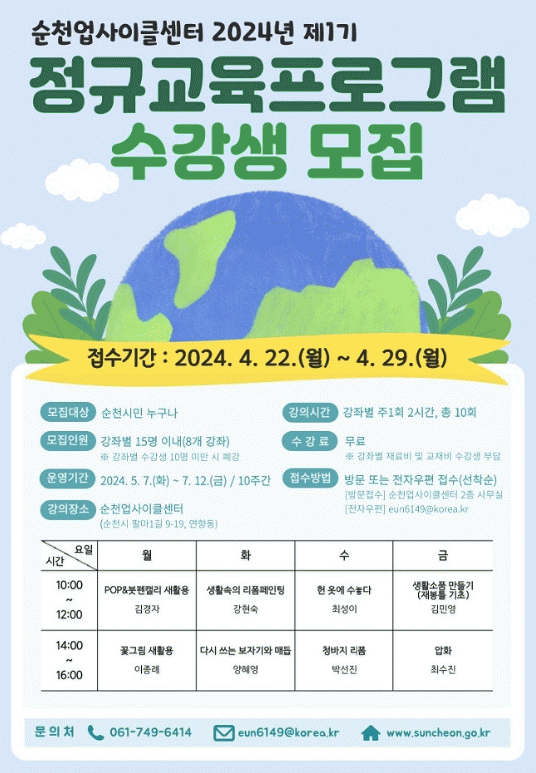 참가를 희망하는 순천시민은 오는 29일까지 업사이클센터 방문 또는 전자우편으로 신청하면 된다. 수강료는 무료이며, 강좌별 재료비 및 부자재비는 수강생이 부담하여야 한다.