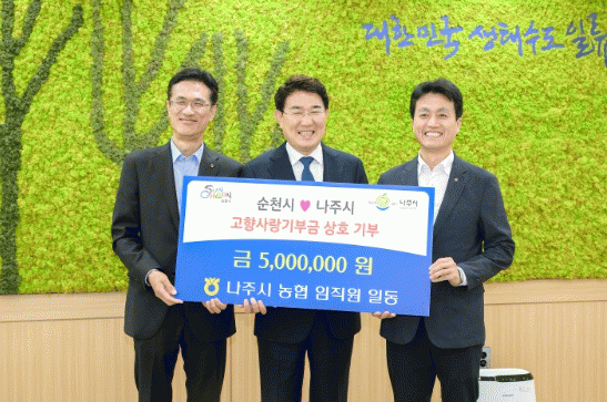 이번 상호 기부는 지난달 21일부터 순천시와 나주시 농협 임직원 총 100명이 참여해 서로의 지역에 500만 원씩 기부했다.