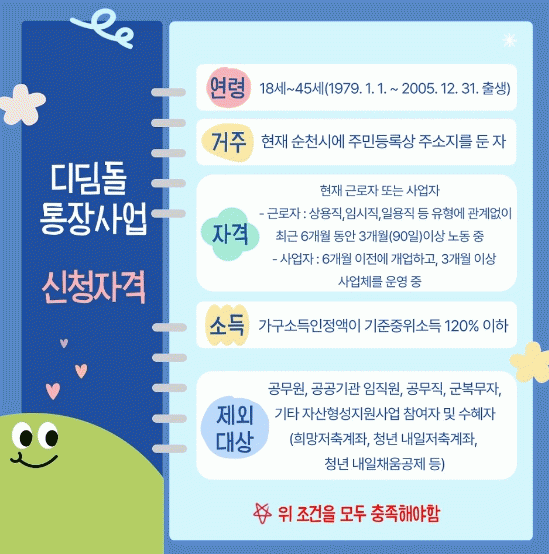 신청대상은 공고일 기준 순천시 거주 18세부터 45세까지의 청년으로 가구소득인정액이 기준중위소득 120%(1인 약 267만원/월) 이하인 자이다. 또한 공고일 기준 최근 6개월 동안 3개월(90일)이상 노동 경력이 있는 근로자이거나 6개월 전에 개업하고 3개월 이상 사업체를 운영 중인 사업자여야 한다.