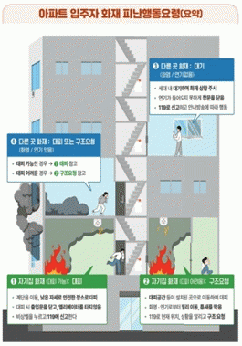 또한, 안내방송을 듣고 화재 층 또는 화재 층과 인접한 층이 아닌 경우 창문을 닫고 화재 상황을 주시하여 세대 내에 대기하는 것이 오히려 안전하다.