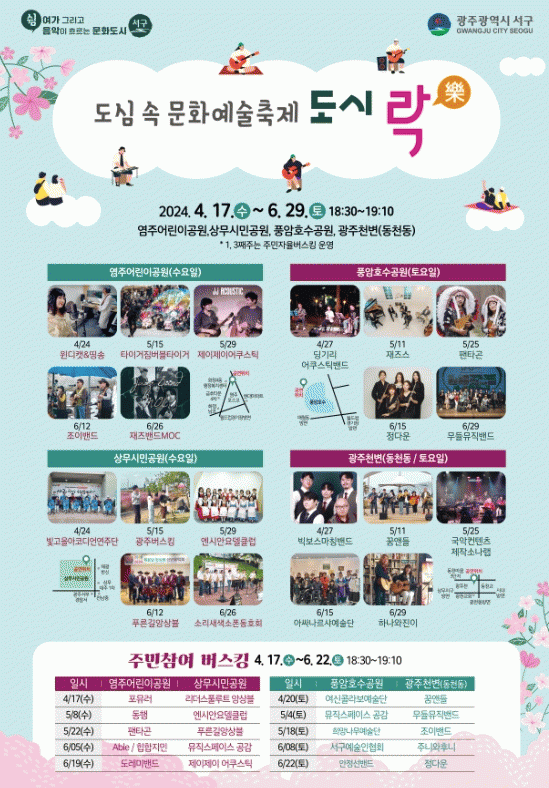 ‘도시 락’은 공모에 선정된 40개 예술단체(둘째주·넷째주)와 주민 자율버스킹(첫째주·셋째주)으로 나뉘어 진행되며 염주어린이공원과 상무시민공원은 매주 수요일, 풍암호수공원과 광주천변(동천동)은 매주 토요일 저녁 6시 30분부터 40분 동안 공연이 펼쳐진다.