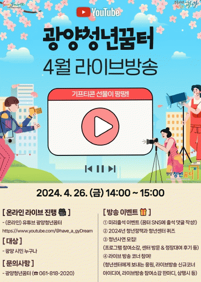 이번 라이브 방송은 오는 26일 오후 2시부터 3시까지 1시간 동안 광양청년꿈터 유튜브를 통해 진행되며 광양청년꿈터 소식 및 다양한 청년 지원 시책 안내, 광양청년꿈터 운영 프로그램 소개, 광양시 청년들의 특별한 사연을 소개할 예정이다.