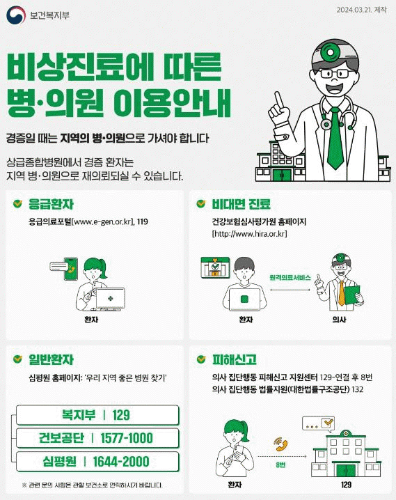 손옥수 복지건강국장은 “전공의 이탈 등으로 남아있는 의료진의 피로가 심한 상급종합병원은 중증·응급환자진료에 집중해 의료진의 소진을 방지해야 한다”며 “경증환자는 동네 병의원에서 진료를 받아주기를 당부드린다”고 말했다.