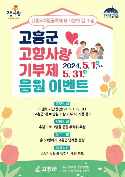 고향사랑기부제 응원 이벤트는 5월 한 달간 진행하며, 10만 원 이상 고흥군에 기부 시 자동 응모된다. 응모자 중 50명을 무작위로 추첨해 별도의 답례품(유자·석류 가공품)을 추가 증정한다. 결과는 6월 당첨자에게 개별 통보할 예정이다.