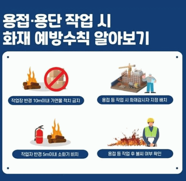 건설현장 용접불티, 절단 안전수칙으로는 ▲화재감시자 지정 및 배치 확인 ▲용접·용단 작업자로부터 반경 5m 이내 소화기 비치 ▲용접·용단 시 주변 가연물 제거 ▲밀폐된 공간에서 작업 시 환기 ▲용접 작업 후 30분 이상 잔불 감시 등의 활동을 강조하고 있다.