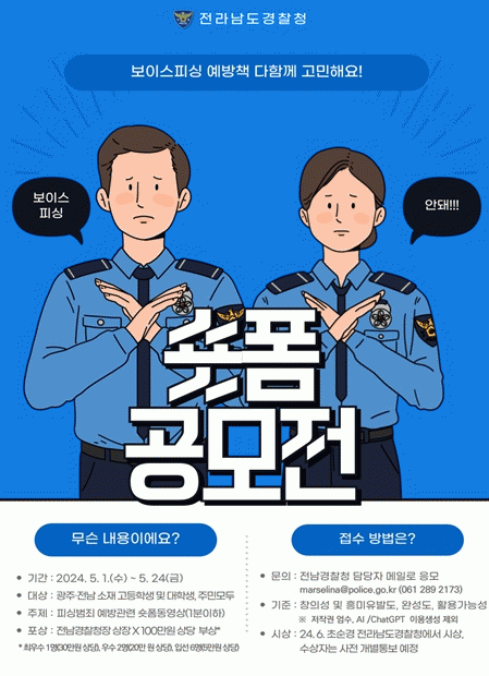 주제는 피싱범죄에 대해 주의할 점, 대응, 심각성 등 피싱범죄 예방과 관련된 내용이다. 형식은 15초~60초 숏폼으로 광주·전남 거주 고등학생 및 대학생, 주민 등 누구나 참여가능하다.