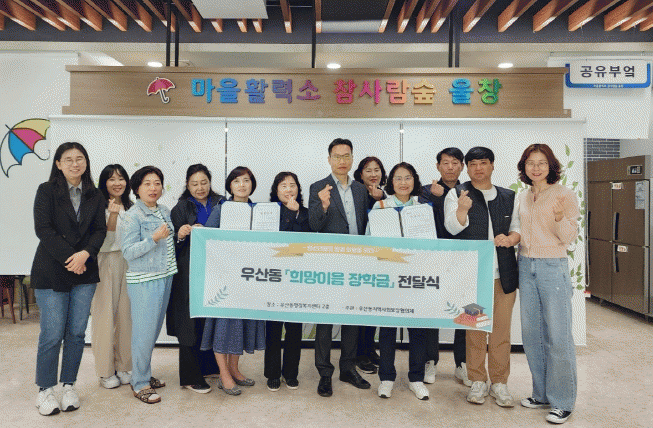 구희숙 우산동 지사협 위원장은 “우리 동네 어린이공원을 깨끗하게 관리하는 봉사활동이 도움이 필요한 학생의 장학금을 지원하는 활동으로 이어져 더욱 뜻깊다”며 “지역 청소년의 미래를 응원하고, 뒷받침하는 노력을 지속하겠다”고 말했다.