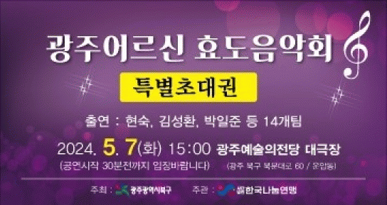 광주 어르신 효 음악회는 문화소외계층 노인을 대상으로 문화공연 향유의 기회를 제공하여 가정의 달을 맞은 어르신에게 공경의 마음을 전하고 일상에 활력을 불어넣고자 북구가 지난해부터 한국나눔연맹과 협업해 마련하고 있는 행사이다.