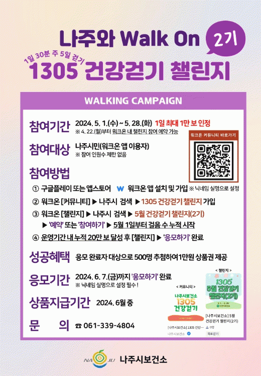 참여방법은 모바일 앱 워크온(WalkOn)을 스마트폰에 설치 후 나주시 커뮤니티 ‘[나주시보건소] 1305 건강걷기 챌린지’에 가입한 다음 예약 또는 참여하기를 누르면 된다. 5월 1일부터 걸음 수가 누적되며, 응모 기한은 6월 7일까지다.