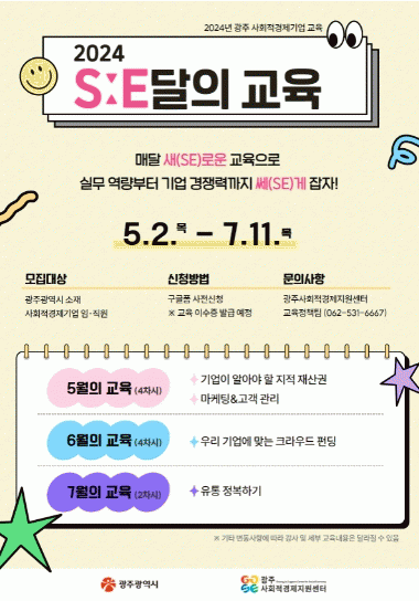 광주시 소재 사회적경제기업 임·직원이면 누구나 참여 가능하며, 23일부터 온라인 링크 또는 광주사회적경제지원센터 누리집을 통해 신청받고 있다.
