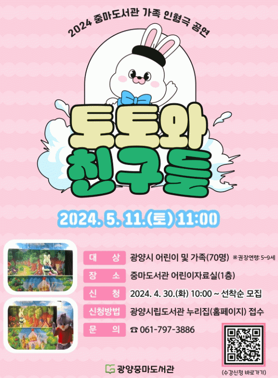 김미라 도서관과장은 “가정의 달을 맞아 교훈과 감동을 온 가족이 만끽할 수 있는 공연을 준비했다”며 “많은 시민이 참여해 가족과 즐거운 추억을 쌓길 바란다”고 말했다.