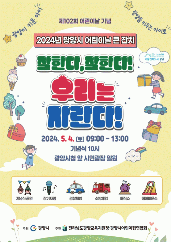 이번 행사는 전라남도광양교육지원청과 광양시어린이집연합회 주관으로 ‘잘한다, 잘한다! 우리는 자란다!’라는 주제로 열린다.