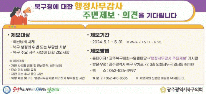 한편 북구의회는 주민과 공감하고 소통하는 열린 의회 실현을 위해 2019년부터 행정사무감사 주민제보를 받고 있으며, 오는 6월 17일부터 25일까지 북구 본청 및 소속 행정기관, 동 행정복지센터 등을 대상으로 행정사무감사를 실시할 계획이다.