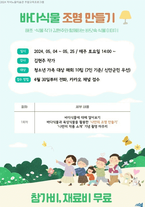 주요 내용으로 바다식물에 대해 알아보고 바다식물과 육상식물을 활용하여 ‘나만의 조명 만들기’가 운영된다.