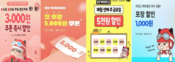 5월 한 달간 ▲주말 이벤트((매주 토요일, 일요일) 공공배달앱 먹깨비로 1만 5,000원 이상 주문 시 3천원 할인), ▲첫 주문 시 5천원 할인, ▲먹깨비의 날(매월 3째주 금요일) 5천원 할인, ▲포장 주문 1,000원 할인 등의 다양한 할인 이벤트가 예산 소진 시까지 진행될 예정이며, 무안군민 누구나 매일 1인 1회의 혜택을 받을 수 있다.