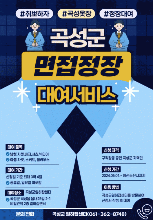 정장 대여를 원하는 구직자는 곡성군 일하잡(JOB)센터(비빌언덕25 2층)에 방문해 신청서를 작성하면 대여가 가능하고, 사후에 면접 증빙자료를 제출하면 된다.