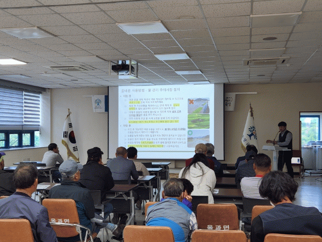이날 교육은 모판 관주처리 기술 전문가가 강사로 참여해 모판 관주 권장 약량과 살포법 등에 대해 교육을 실시하고, 궁금한 사항에 대해 질의하는 시간을 가졌다.