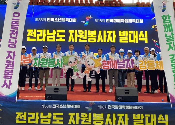 발대식에선 명창환 전남도 행정부지사, 전경선 전남도의회 부의장, 박홍률 목포시장 등 내빈과 10대부터 80대까지 다양한 연령층의 자원봉사자 700여 명이 참석해 ‘으뜸전남 자원봉사! 함께날자 감동체전!’을 슬로건으로 굳건한 성공개최 의지를 다졌다.
