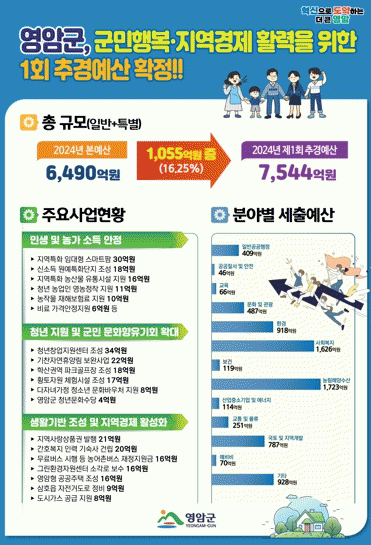 4월30일 영암군의회 의결로 확정된 제1회 추경은, 올해 본예산 대비 16.25% 1,055억원이 증액된 규모로, 일반회계는 15.49% 914억원 증가한 6,815억 원, 특별회계는 23.89% 140억원 증가한 729억원이다.