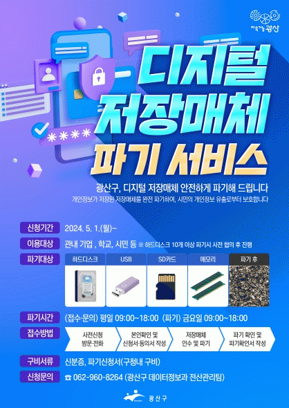 최근 중고로 판매된 하드디스크에서 수백 건에 이르는 시민의 개인정보가 발견되는 등의 개인정보 유출 사고가 빈번히 발생함에 따라 광산구가 새롭게 도입한 서비스다.