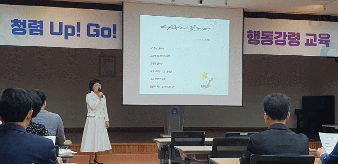 2일 동부교육지원청에 따르면 이번 행사는 올해 청렴도 종합계획에 따라 직원들의 청렴 의식을 높이고 동부교육지원청만의 색다른 청렴 조직문화를 만들기 위해 마련됐다. 조동화 시인의 시 ‘나 하나 꽃피어’를 청렴 정책 추진 의지를 담아 개작한 시 ‘나 하나 청렴하여’를 정성숙 교육장이 앞에 나서 전 직원과 함께 낭송했다.