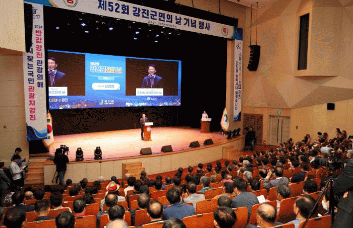 대공연장의 양쪽에선 ‘소통, 연결, 창조의 신강진, 군민과 행복시대 열겠습니다’, ‘2024 반값 강진 관광의 해, 다시찾는 국민 관광지 강진’이 쓰여진 대형 현수막이 양쪽에 나란히 걸려, 올 한해 군에서 역점 추진 중인 반값 관광을 통한 새로운 도약의 의지를 다졌다.