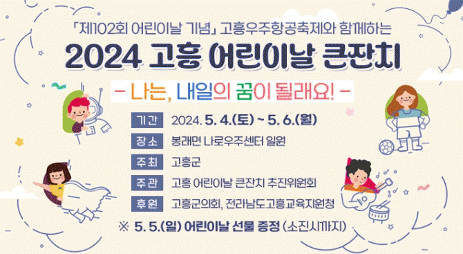 어린이날 큰잔치 추진위원회(위원장 박경석) 주관으로 열리는 이날 행사는 ‘제14회 고흥우주항공축제’와 병행해 추진하게 됐으며, 5월 4일부터 6일까지 3일간 총 100여 종의 다채로운 프로그램이 펼쳐질 예정이다.
