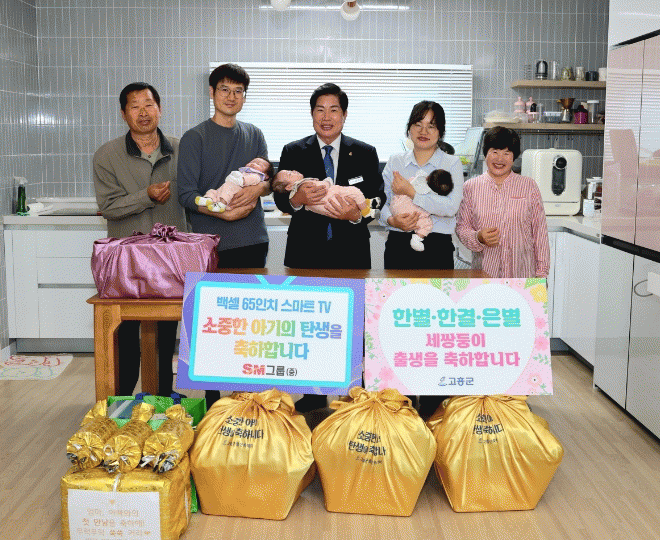 이번에 전달된 65인치 스마트 TV는 지난 4월 18일 SM그룹(우오현 회장, 고흥군 풍양면 출신)에서 고흥군 출산가정을 위해 기탁한 제품이며, 이번 남양면 세쌍둥이 가정이 1호 선물 대상자로 선정됐다. 출산가정 세쌍둥이는 남아 1명, 여아 2명으로 현재 산모와 함께 건강하게 성장하고 있다.