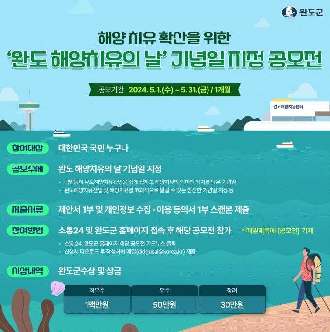 공모전은 완도군이 역점 추진하는 해양치유산업과 국내 최초로 개관한 완도해양치유센터를 대외적으로 알려 해양치유 확산 및 완도의 위상을 드높일 수 있는 기념일을 지정하기 위해 마련됐다.