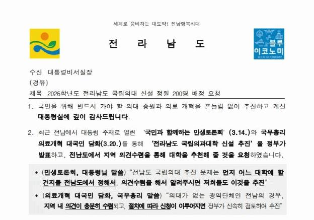 전남도는 또 ‘정부가 요청한 대학 추천 절차를 원활하게 잘 수행하도록 최선을 다하겠다’는 입장을 밝히고, 5월 대입 전형 시행계획에 2026학년도 전라남도 국립의과대학 신설 정원 200명을 배정해줄 것을 요청했다.